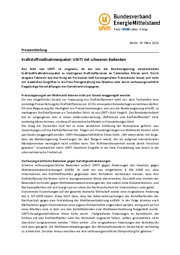 Kraftstoffmaßnahmenpaket: UNITI mit schweren Bedenken