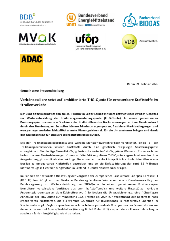 Verbändeallianz setzt auf ambitionierte THG-Quote für erneuerbare Kraftstoffe im Straßenverkehr