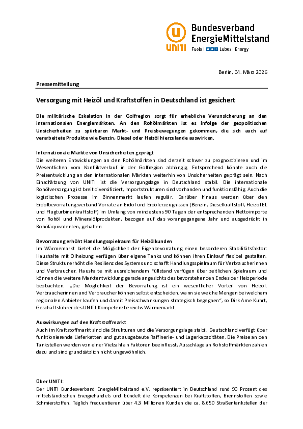Versorgung mit Heizöl und Kraftstoffen in Deutschland ist gesichert