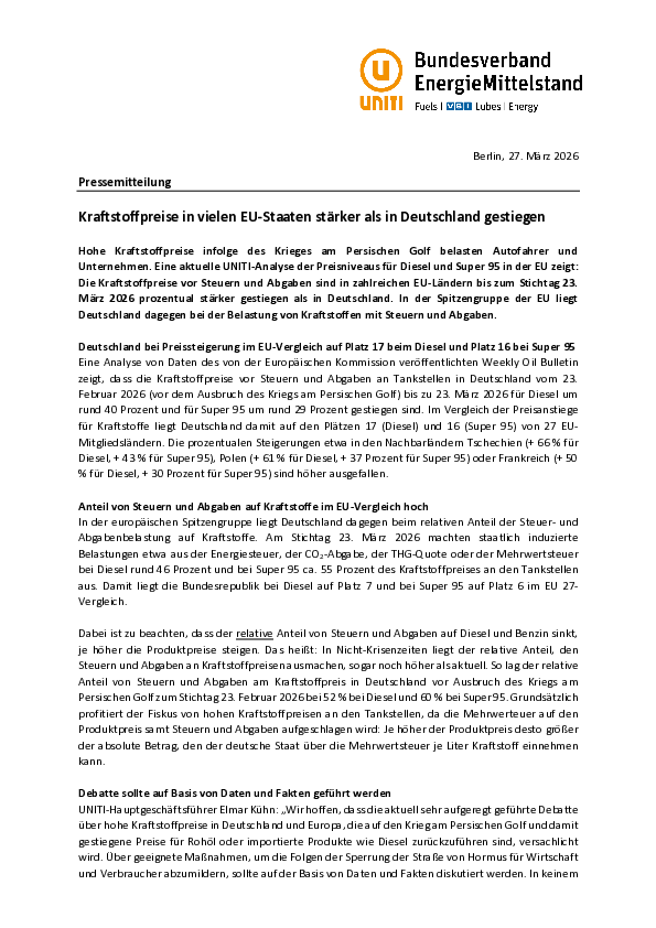 Hohe Kraftstoffpreise infolge des Krieges am Persischen Golf belasten Autofahrer und Unternehmen. Eine aktuelle UNITI-Analyse der Preisniveaus für Diesel und Super 95 in der EU zeigt: Die Kraftstoffpreise vor…
