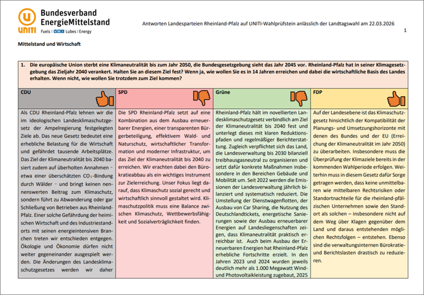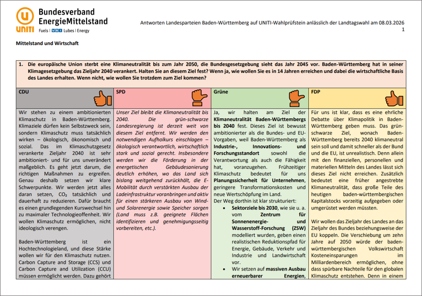 Zu den im März 2026 stattfindenden Landtagswahlen in Baden-Württemberg und Rheinland-Pfalz hat UNITI den Landesparteien SPD, CDU, Bündnis 90/Die Grünen und FDP seine Wahlprüfsteinfragen zugesandt. Die Antworten der Landesparteien sind in einer vergleichenden Übersicht zusammengefasst und symbolisch bewertet.